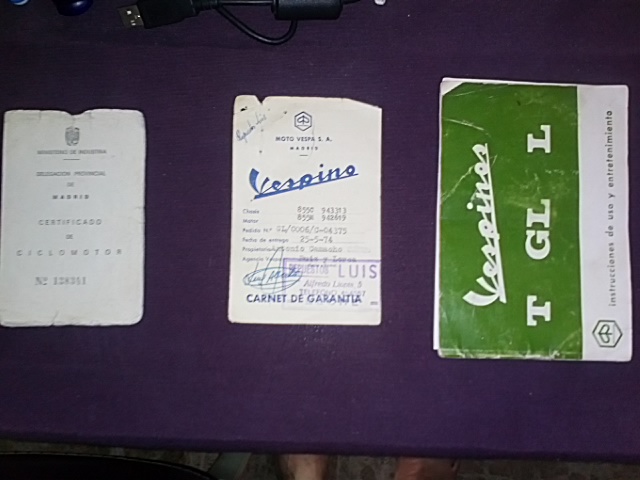 Buenas a todos, acabo de restaurar un gl del 74, mi duda es, he estado leyendo el fenomenal asunto de vespinaire para dar de alta su gl, pero mi duda es, primer paso ir al ayuntamiento de madrid a pedir el certificado, despues pasar una itv, en mi caso creo que lo voy a tener facil ya que tengo un pequeño enchufe en la itv de seseña jejeje, despues realizar contrato de compra y venta con el anterior dueño, y la duda es,,,,,con todo esto ya en regla podria llevarlo a una gestoria y que ellos tramitaran todo??? no es que me sobre la pasta pero es que con mi curro tengo muy poco tiempo para ir a trafico, hacienda y demas requisitos para poder realizar la puesta en regla. Gracias por adelantado. Os dejo fotos de los documentos que tengo del vespi.....