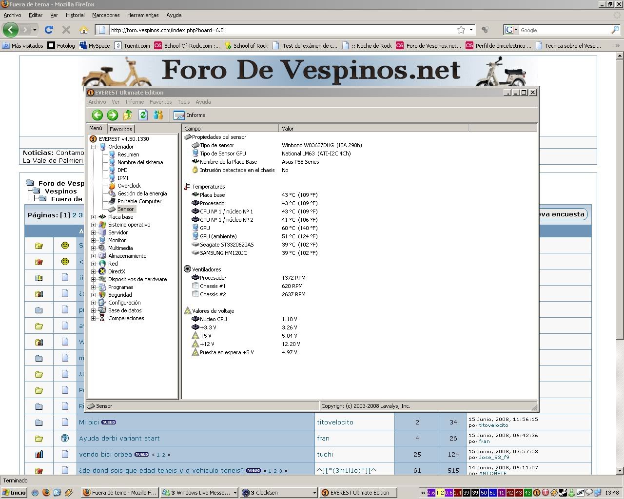 Ea pos ay van mis temp. Hay que decir, que es por la mañana, y que solo tengo abierto el msn y el safari, con esta pagina(por cierto, os lo recomiendo) Y tambien hay que decir, que tengo una base refrigeradora, aunque no me hace nada de nada. Respecto a las temperaturas, se pueden medir, por ejemplo, con un programa que se llama Everest Ultimate Edition Saludossss