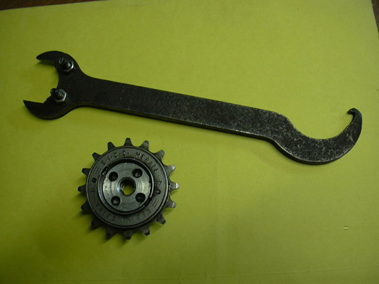 Hola amigos : Es posible que a alguno de nosotros ya se le haya ocurrido como desmontar el piñon "Bici" de nuestro vespino.En esta misma web he visto un tutorial estupendo en donde se nos dice cómo hacerlo pero es un poco complicado para el que no tiene equipo de soldadura ni torno.Quiero enseñaros ahora la herramienta que he tenido que improvisar para sacar el piñon aprovechando una llave plana vieja de 6 mm de espesor y dos tornillos M-6 .Desde luego hay que hacer en la llave dos agujeros de 6 mm manteniendo entre centros una distancia de 24 mm.-Igual todo esto ya lo sabeis ,no obstante lo dejo aquí porr si a alguien le es útil.-Si teneis que sacar el piñon alguna vez,os recomiendo que lo hagais con la rueda trasera montada ya que podreis hacer más fuerza.Saludos