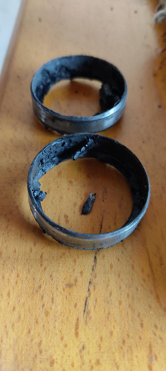 Buenas a todos, se que este post tiene mas tiempo que las sopas de ajo, pero quería aportar a quien se aventure en esta ardua tarea de sacar el dichoso reten, un pequeño truqui para desprender la goma antes de calentarla con el soplete y así no dejar restos de goma pegada dentro de la botella y dejar olor a rueda quemada en el lugar de trabajo. Cociendo la botella con la parte del reten sumergida en agua hirviendo la goma sale bastante bien, lleva tiempo, unos 15 minutos, mucho cuidado al sacar la botella de la suspensión del agua que quema como un demonio, después siguiendo los pasos de tutorial, (Una pena que no tenga fotos) el reten sale bien, yo por desgracia tendré que pintar las botellas de la suspensión ya que me calenté dándole con el soplete para poder sacarlo a la primera apalancando con el destornillador y sin necesidad de martillo, mas que nada por el miedo de marcar el interior de la botella. Mando una fotico de los puñeteros retenes después de sacarlos. Saludos.