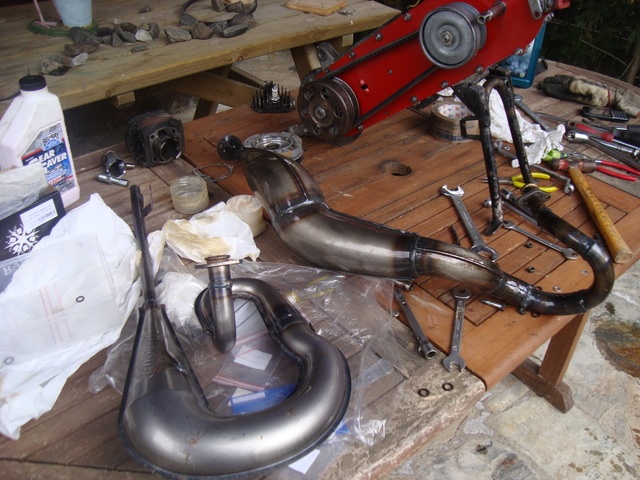 Hola, no veo realmente el inconveniente en pasar la ITV para un modelo como el de la parte superior de color azul que sería un símil a lo que quiero hacer, tampoco veo tan descabellado presentarme en la ITV con algo así, igualmente la barra central que aguantará el deposito será de quita y pon por sí me pusieran problemas de aquí a dos años y por el tema de la banqueta no veo inconveniente ni por los del manillar. Ayer me llegaron los neumaticos! Ya tengo ganas de arreglar el radio roto de la llanta de atrás y pintar las llantas. Aquí os pido consejo, en principio las llantas irán pintadas con pintura de coche y en cabina ya que mi tío trabaja en un taller con cabina y puedo aprovecharme de el en ese sentido, la duda aguantara bien la pintura en las llantas, radios y bujes? Monto antes los neumaticos o Pinto las llantas desmontadas por completo? Aparte he pedido consejo sobre mi motor a Jaime García de García Racing y me ha recomendado un cilindro 65 kuro y un variador pinas o preparado por ellos. Aparte estoy buscando un motor de f9 preparado para quitarme problemas con los montajes, y sólo sea apretar dos tornillos así que si tenéis algo comentadmelo. He pedido también el foco delantero nuevo similar al de la derbi antorcha, mercurio etc.. Me llegara sobre el lunes a ver como pinta. Otra de las dudas que tengo, tenía pensado bajar algo el Vespino, de la parte trasera quiero hacerlo adelantando la espiga a la que va alojado el amortiguador por la parte superior y darle más inclinación hasta bajar lo que quiero, por el contrario al variar tanto el ángulo el amortiguador hará menos fuerza y tendré una suspensión más blanda y había pensado también un poco por estética colocar otro amortiguador en paralelo a este soldando otra espiga superior al chasis y fabricando un nuevo anclaje de la parte inferior. Del tema de fabricación de piezas no tengo problemas ya que trabajo en un taller en el que hay tornos fresas rectificadoras y varios centros de control numérico en los cuales ya he fabricado muchas piezas de la SANGLAS. Yo me dedico al diseño 3D de piezas y a su mecanizado en CAM y voy mareando por el taller lo que me deja el trabajo. Bueno a ver si mañana puedo poner alguna foto de los neumaticos y cuando me llegue el foco igual. Los neumaticos en 2,5x18 van a ir bien juntitos para no tocar el motor así que ya veré que hago sí toca. Otra pregúntilla a ver si me hago entender, el deposito inferior lo he quitado y para rellenar un poco ese vacío he pensado en colocar un filtro directo al carburador de potencia tipo metálico o de espuma y segundo ya que no tengo mucho problema en soldar con TIG era el buscar una bufanda que haga el ensanchamiento en la curva tipo el PULA y modificarle el empalme con la salida de cilindro subiendo toda la bufanda al lugar donde iría el deposito y después de la curva de la bufanda soldarle el escape original que llevo ya que me gustaría conservar su estética, Jaime García me ha comentado que podría utilizar el de serie así que intentare conservarlo, os dejo alguna foto de la idea. Ufffff vaya tostón he pegado hoy, lo siento. Bueno a seguir dándole vueltas a esto un saludo.