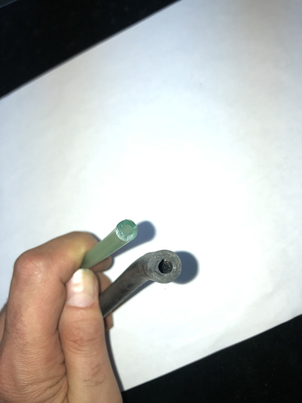 Hola. Quería preguntaros qué tubo de gasolina o macarrón usáis. Yo en mis vehículos siempre he puesto de goma, de ese que es reforzado con una membrana que se ve en los corte. Pero como al comprar el grifo nuevo del Vespino me llegó con tubo macarrón, del transparente, pues se lo puse. La verdad es que, a pesar de que casi no se ve, es más bonito y te permite ves al momento si hay gasolina. El problema es que ayer le instalé un filtro para la gasolina, porque por más que limpio el depósito siempre suelta un poco de arenilla. Que por cierto la vi gracias al tubo transparente. En fin, que al tocarlo para cortarlo estaba endurecido. En menos de un mes ha pasado de ser totalmente flexible a semi-rígido. Al calentarse vuelve a estar flexible, pero frío se endurece. Esto no me acaba de gustar, porque si en un mes está así, dentro de un año o dos.. ¿Se va a quebrar como si fuera cristal? El de goma negra dura muchísimos años, los he cambiado con 20 años que aún tenían flexibilidad. Os pongo unas fotos. Saludos.